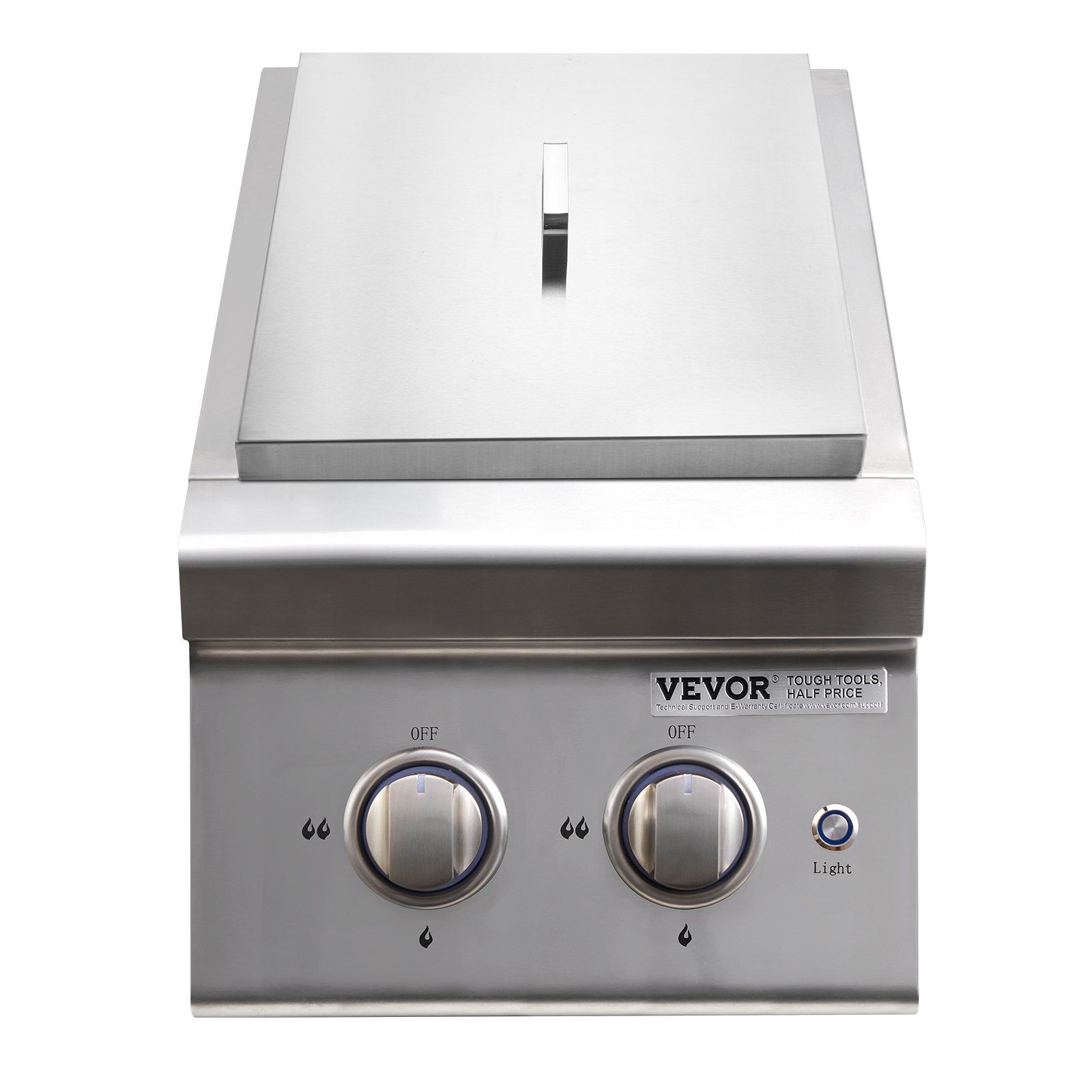 1.Strong Flame: Equipped with two efficient 17,000 BTU burners, this double side burners provide powerful heat output, allowing you to stir-fry and simmer sauces simultaneously. The built-in burners ensure stable cooking even in windy conditions. The control knobs with LED light provide clearer operation at night, giving you full control over the flame