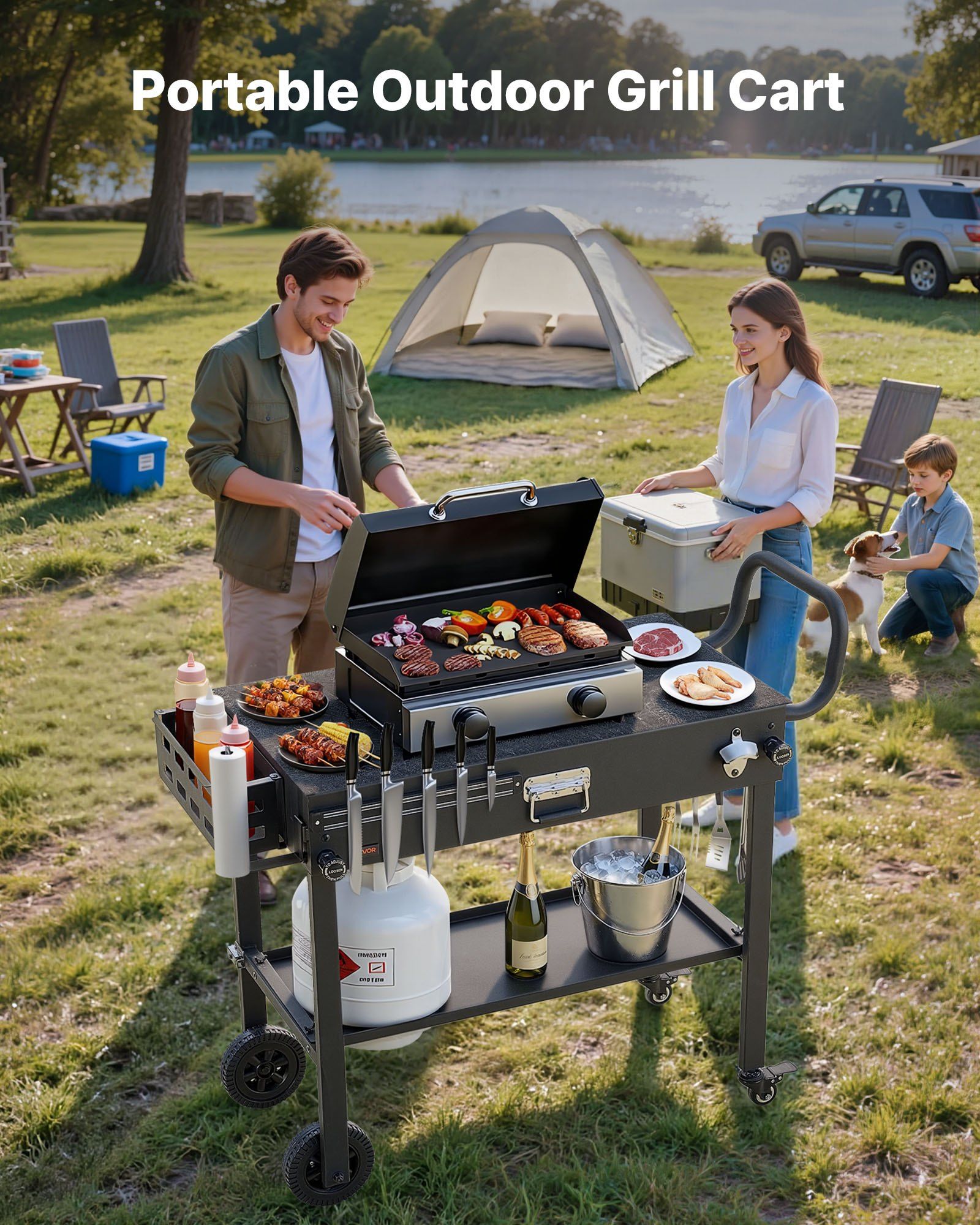2.Strong Steel Build: Crafted from heavy carbon steel with a rust-resistant coating, the grill cart table stands up to temperature shifts and routine wear while keeping movement steady. With a 220 lbs/100 kg weight limit, it maintains its form and supports demanding outdoor cooking tasks