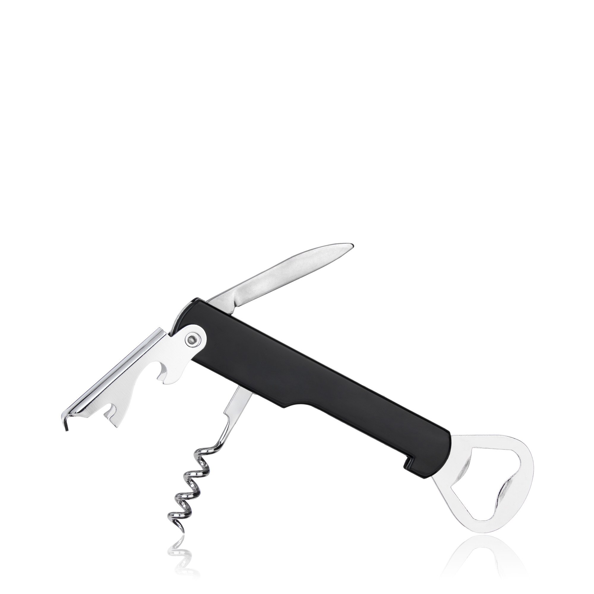 A jack-of-all-trades opener for any container, the Jack™ Multi-Use Bottle Opener compiles a corkscrew, beer cap opener, foil cutter and churchkey in one compact black-and-silver package so you can always be prepared.
